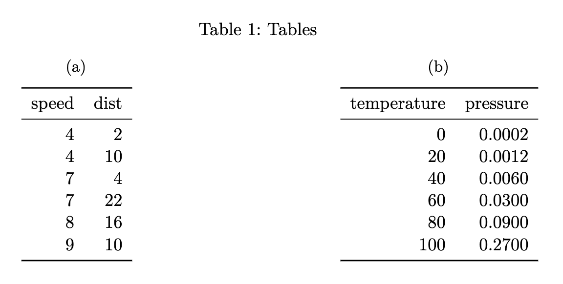 Two tables side-by-side. Each table has 2 columns and 8 rows. The table on the left is titled '(a) Cars'. The table on the right is titled '(b) Pressure'. Centered underneath both tables is the text 'Table 1: Tables.'