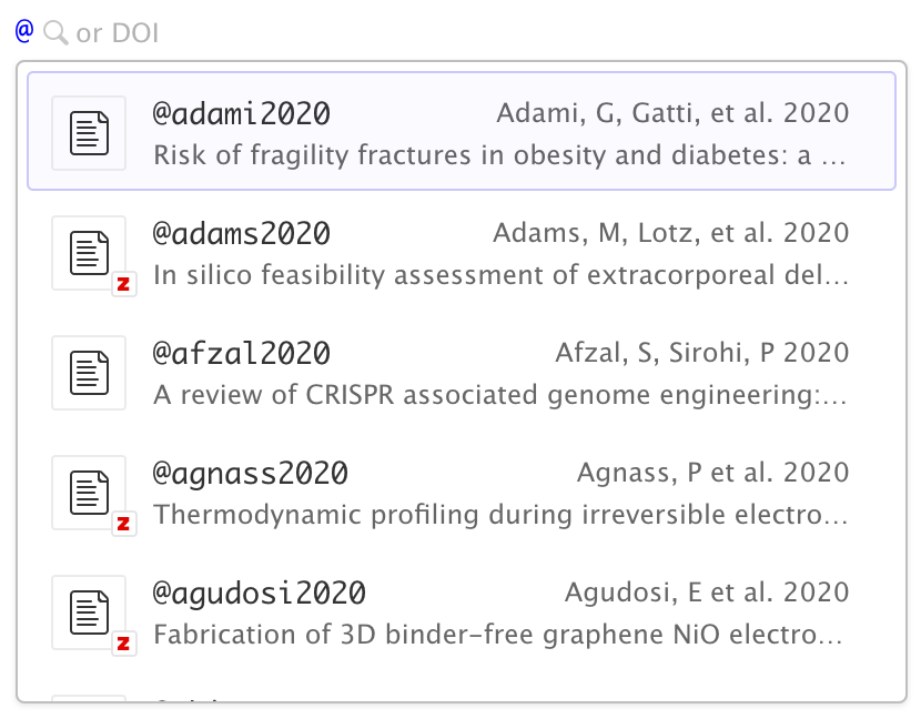 You can also insert citations directly using markdown syntax (e.g. [@cite]). When you do this a completion interface is provided for searching available citations: